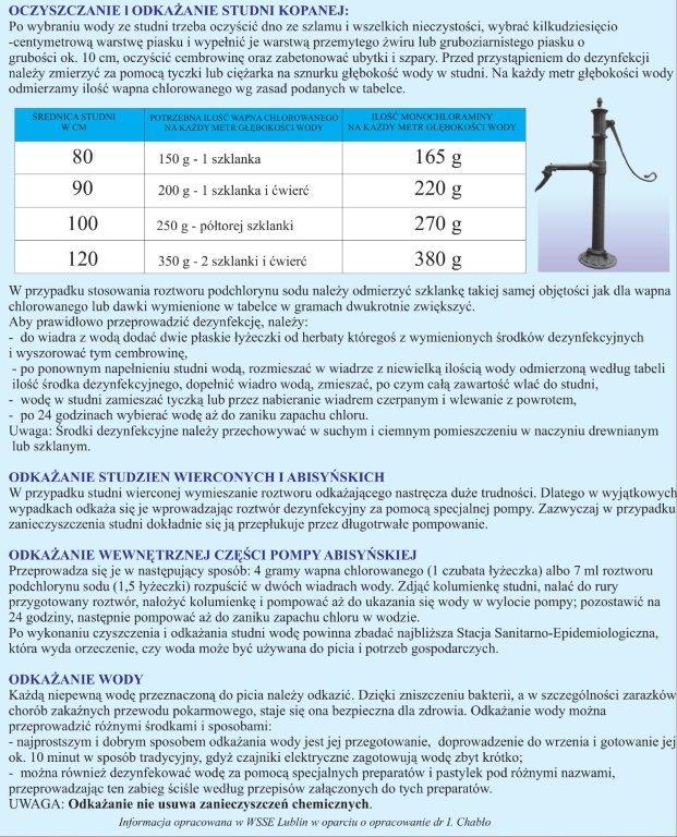 W sezonie letnim zaopatrzenie ludzi w wodę podlega kilku zasadniczym czynnikom, a jednym z nich są dynamiczne zjawiska pogodowe, coraz dotkliwsze w ostatnich latach, którym towarzyszą m.in. ulewne deszcze. Deszcze mogą prowadzić do obszarowych podtopień i zalań ujęć wody. Płynąca woda może nieść nie tylko zanieczyszczenia powierzchniowe, głównie z pól, ale również zawartość szamb, nielegalnych wysypisk śmieci czy zanieczyszczenia z cmentarzy. Zalania ujęć oraz przerwania ciągłości instalacji wodociągowych w czasie podtopień mogą być źródłem zanieczyszczeń, mogących wykazywać zmiany w jakości dostaraczanej wody, a w konsekwencji mogą mieć negatywne działanie zdrowotne dla konsumentów. W przeciwieństwie do wody pochodzącej z wodociągów zbiorowego zaopatrzenia w przypadku prywatnych ujęć woda nie podlega stałemu monitorowaniu pod względem jakości i bezpieczeństwa dla zdrowia. To właściciel studni jest zobowiązany, by zadbać o odpowiednią jakość wody, z której korzysta. W przypadku wystąpienia sytuacji kryzysowych takich jak podtopienia i zalania własnych ujęć wody należy przeprowadzić procesy czyszczenia oraz dezynfekcji studni. Istnieje szereg różnych sposobów na skuteczną dezynfekcję wody. Rodzaj zastosowanego procesu bądź technologii jest w dużej mierze uzależniony od warunków panujących w danym gospodarstwie domowym oraz możliwości technicznych. Najczęściej stosowaną metodą dezynfekcji w gospodarstwach domowych jest chlorowanie wody. W tej metodzie do wody dodaje się chlor w formie gazowej, podchloryn sodu lub na przykład podchloryn wapnia. Dozowanie preparatów musi być ściśle przestrzegane i zgodne z opisem producenta oraz instrukcją zastosowania. Plusem zastosowania tego typu dezynfekcji chemicznej jest możliwość odkażenia nie tylko wody w samej studni, ale także całej instalacji. Po wykonaniu czyszczenia i odkażania studni, woda z niej powinna być zbadana w celu sprawdzenia czy odpowiada wymaganiom sanitarnym.