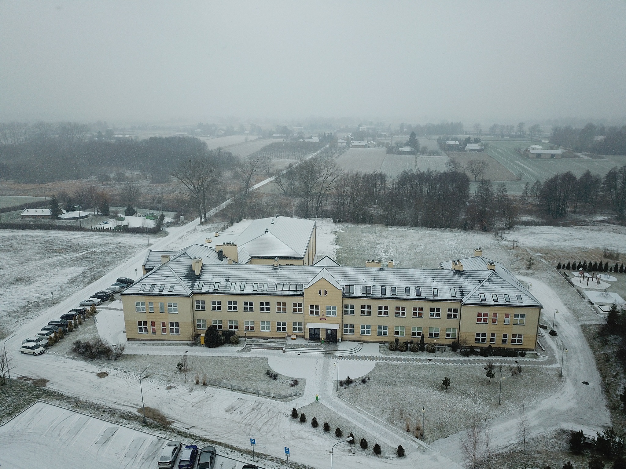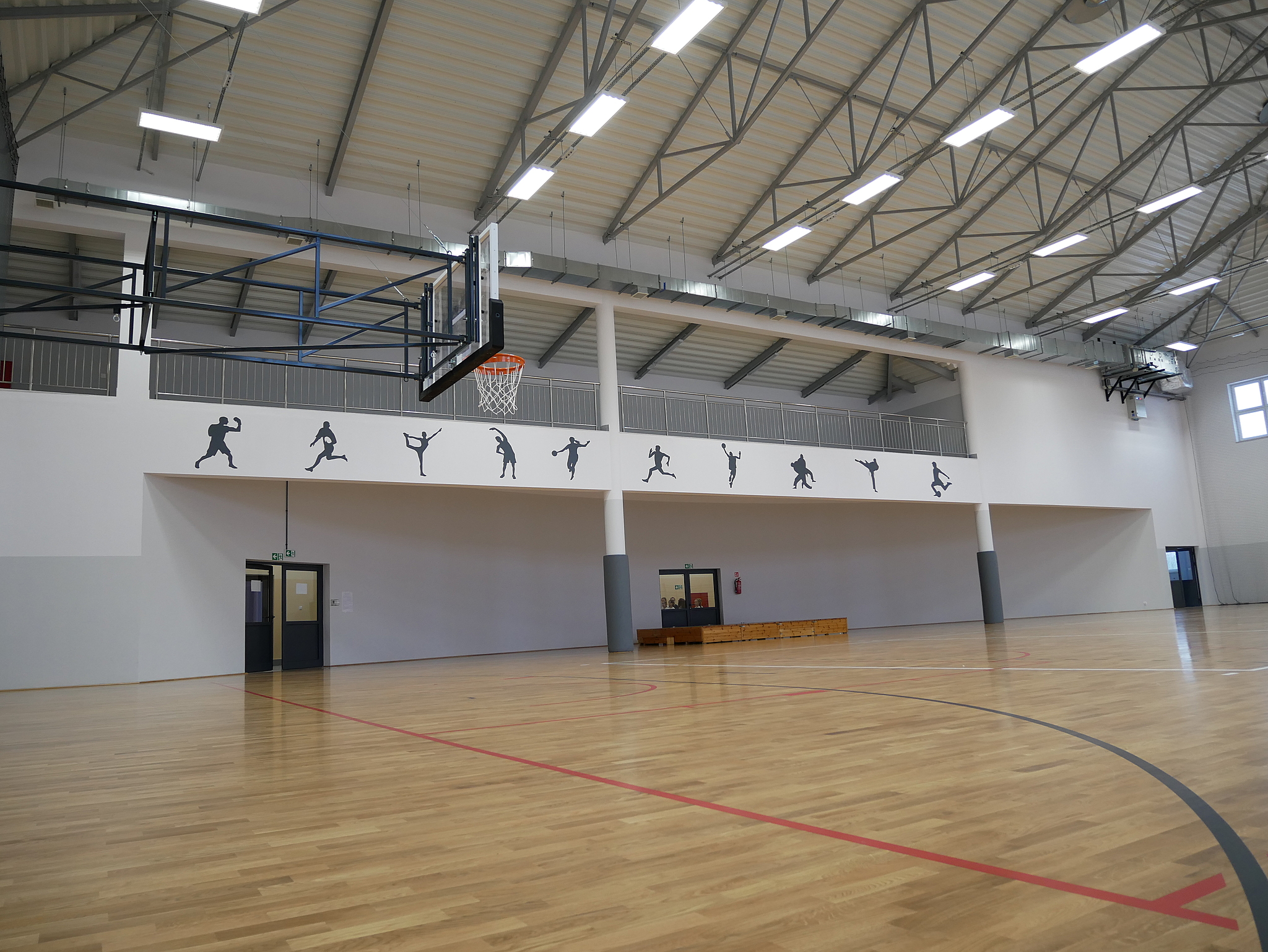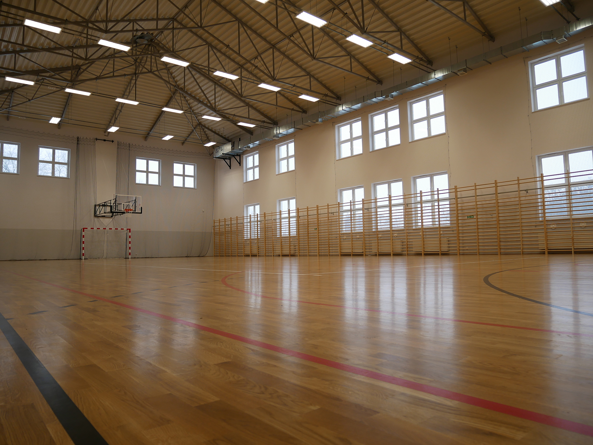 17,70 m x 35,70 m wzbogaconej o miejsce dla widowni z 5 rzędami trybun oraz antresoli. Całkowita powierzchnia części sportowej to 757,4 m2 a wysokość do najniższego elementu konstrukcji dachu wynosi 8,80 m. Druga przestrzeń stanowią pomieszczenia zaplecza, które mieszą szatnie o powierzchni 20,8 i 21,1m2 połączone z zapleczem sanitarnym (toaleta, umywalki, kabiny prysznicowe), wyodrębniono także toaletę o powierzchni 7,4m2 w pełni dostosowaną na potrzeby osób niepełnosprawnych. W budynku ponadto znajduje się magazyn na sprzęt sportowy oraz 4 sale dydaktyczne przeznaczone do prowadzenia zająć w mniejszych grupach.