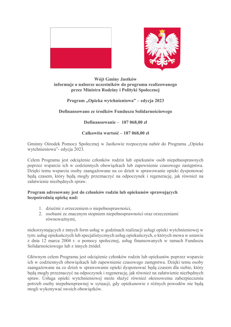 - PROGRAM OPIEKA WYTCHNIENIOWA EDYCJA 2023- https://www.gov.pl/attachment/f0d737cd-c6cc-4e51-a37c-ec026a9bbe13