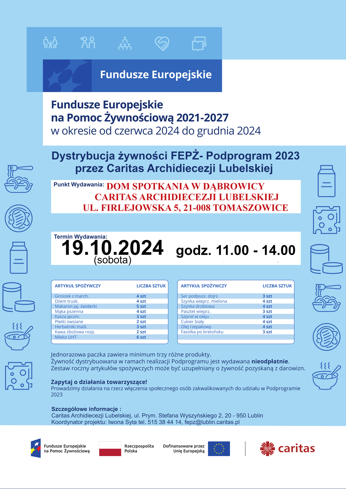 Gminny Ośrodek Pomocy Społecznej w Jastkowie informuje, że w dniu 19 października 2024 roku (sobota) w godz. od 11.00 do 14.00 w Domu Spotkania Caritas w Dąbrowicy ul. Firlejowska 5 będą wydawane paczki żywnościowe dla osób, które zostały zakwalifikowane do otrzymania pomocy żywnościowej w ramach Programu Fundusze Europejskie na Pomoc Żywnościową 2021-2027 - Podprogram 2023 współfinansowanego z Europejskiego Funduszu Społecznego Plus.