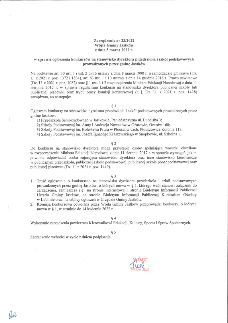 OGŁOSZENIE KONKURSÓW NA STANOWISKO DYREKTORA PRZEDSZKOLA I SZKÓŁ PODSTAWOWYCH PROWADZONYCH PRZEZ GMINĘ JASTKÓW