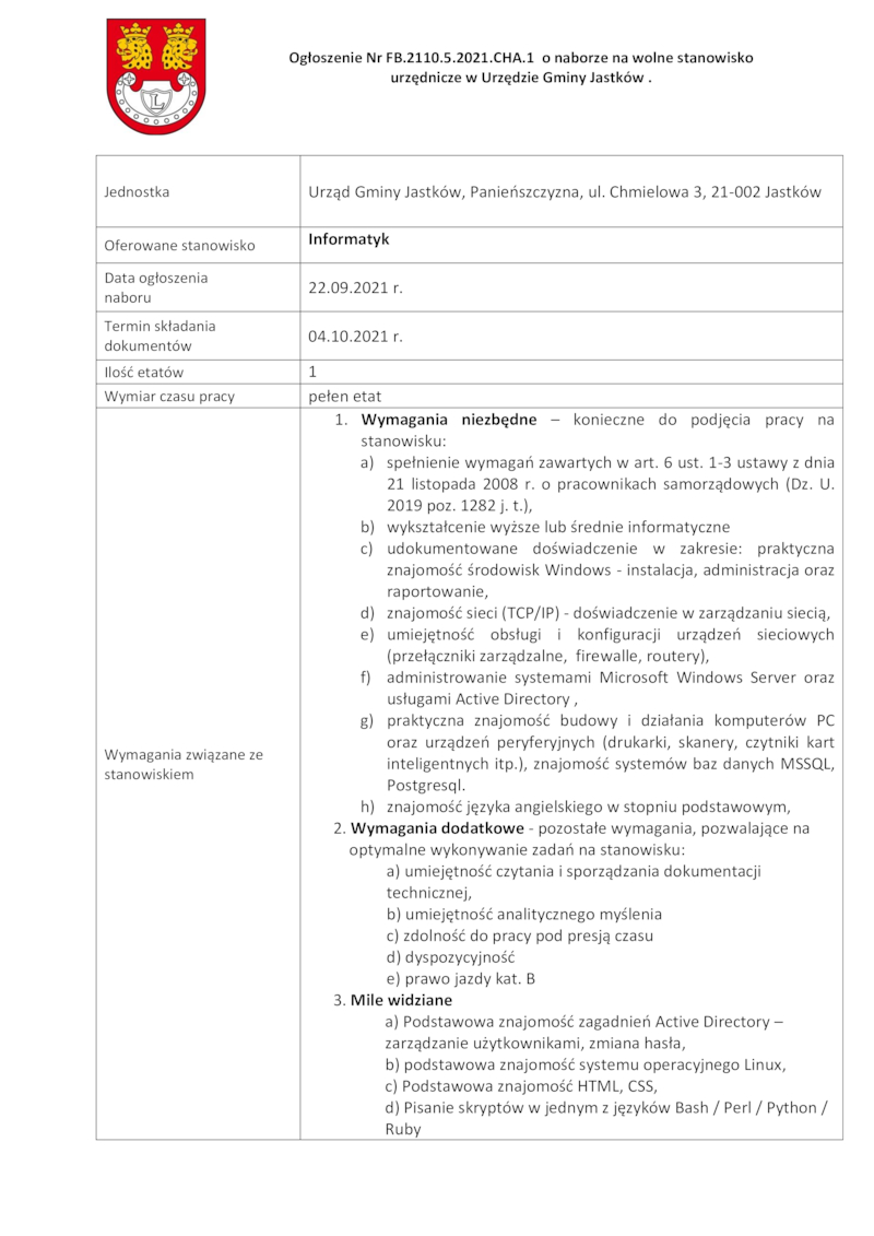 OGŁOSZENIE NR FB.2110.5.2021.CHA.1 O NABORZE NA WOLNE STANOWISKO URZĘDNICZE W URZĘDZIE GMINY JASTKÓW