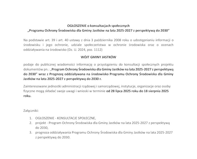 OGŁOSZENIE O KONSULTACJACH SPOŁECZNYCH „PROGRAMU OCHRONY ŚRODOWISKA DLA GMINY JASTKÓW NA LATA 2025-2027 Z PERSPEKTYWĄ DO 2030”