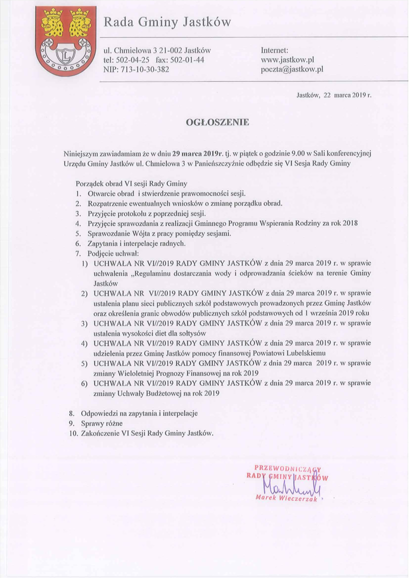 OGŁOSZENIE O VI SESJI RADY GMINY JASTKÓW
