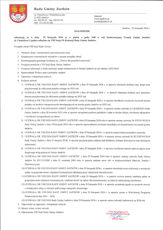 OGŁOSZENIE O VIII SESJI IX KADENCJI RADY GMINY