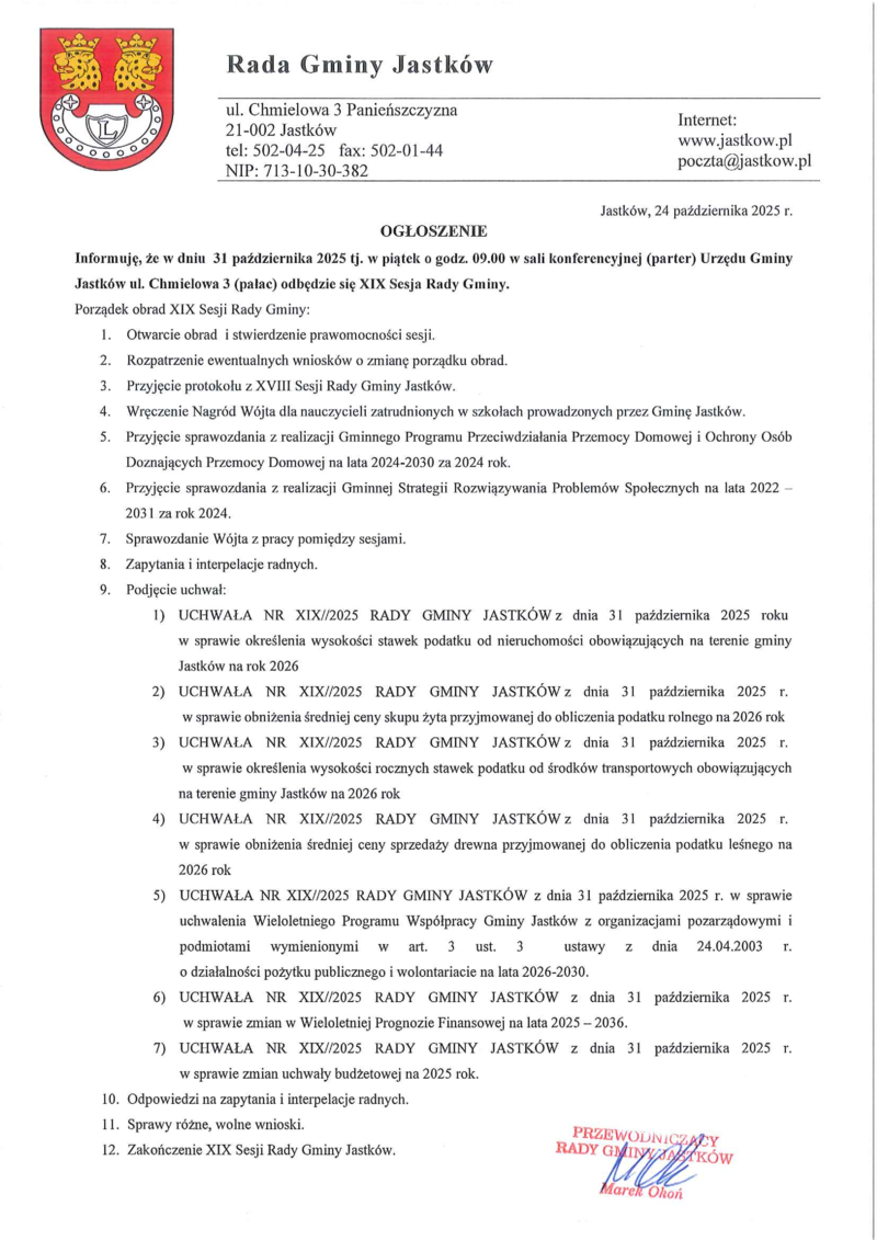 OGŁOSZENIE O XIX SESJI RADY GMINY JASTKÓW