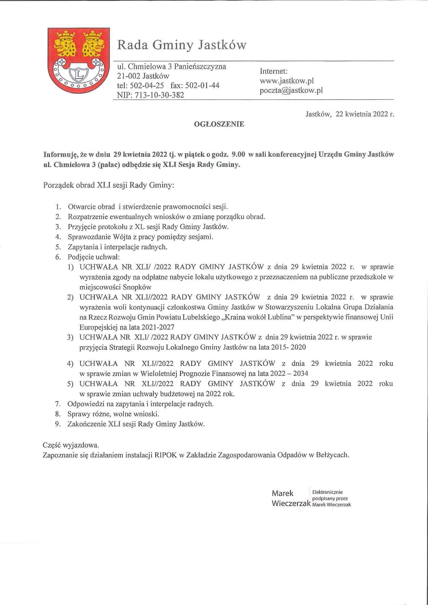 OGŁOSZENIE O XLI SESJI RADY GMINY