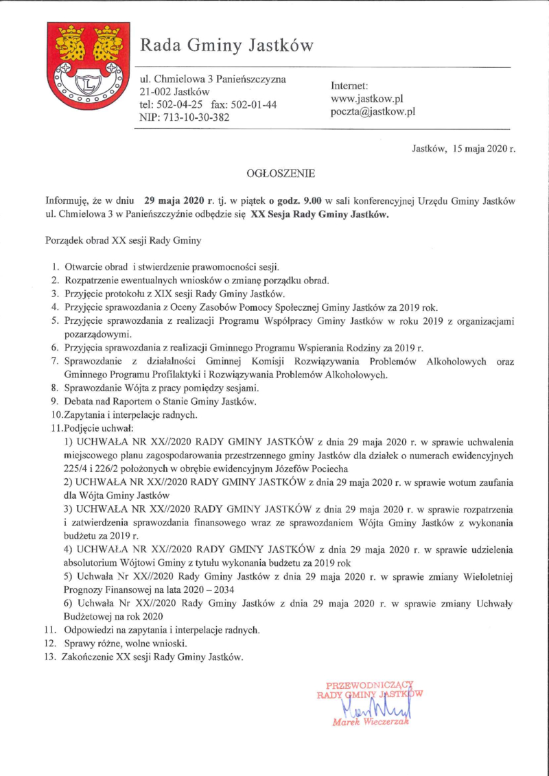 OGŁOSZENIE O XX SESJI RADY GMINY JASTKÓW
