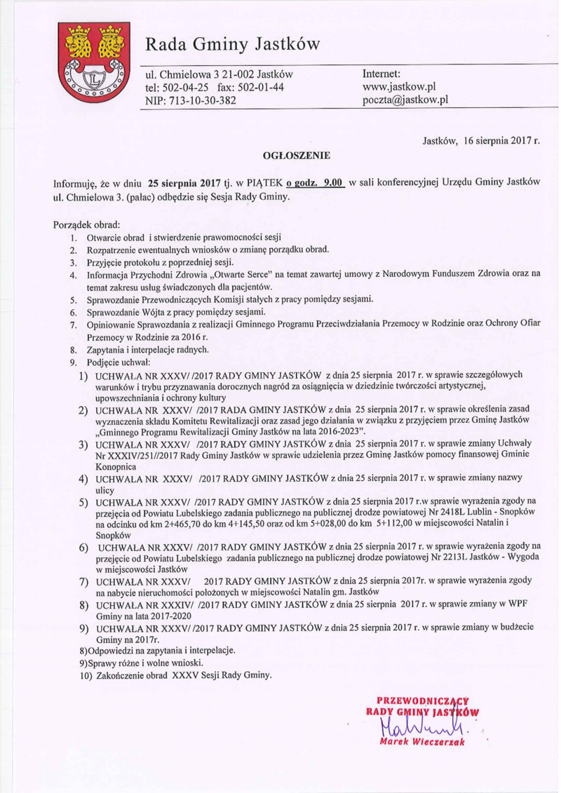 OGŁOSZENIE O XXXV SESJI RADY GMINY JASTKÓW 25 SIERPNIA 2017R. GODZ. 9.00