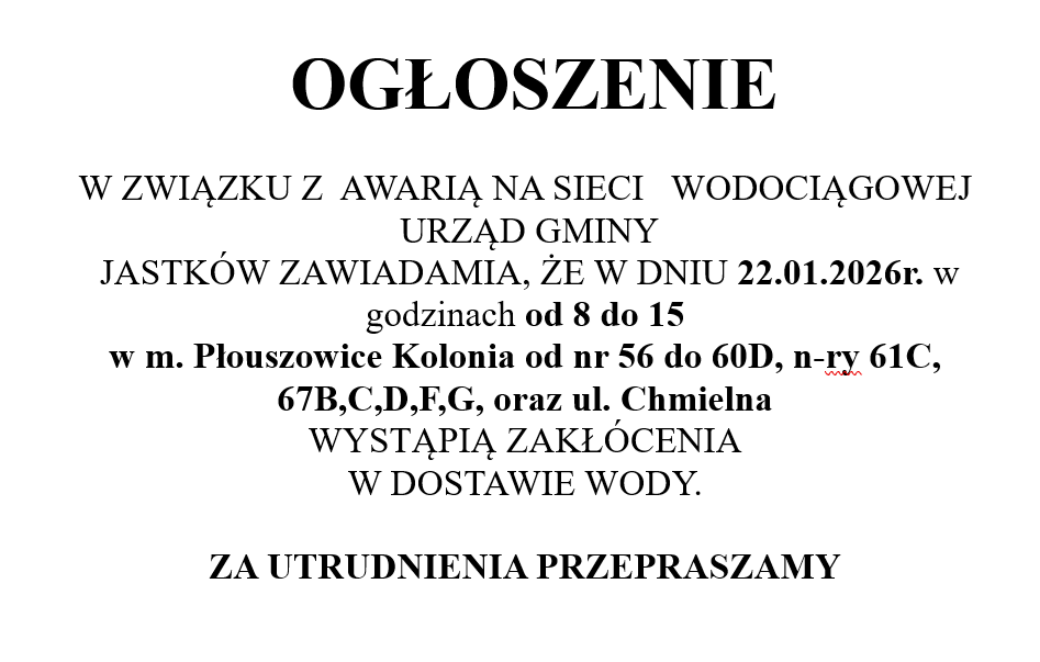 OGŁOSZENIE W ZWIĄZKU Z AWARIĄ NA SIECI WODOCIĄGOWEJ URZĄD GMINY JASTKÓW ZAWIADAMIA, ŻE W DNIU 22.01.2026R. W GODZINACH OD 8 DO 15 W M. PŁOUSZOWICE KOLONIA OD NR 56 DO 60D, N-RY 61C, 67B,C,D,F,G, ORAZ UL. CHMIELNA WYSTĄPIĄ ZAKŁÓCENIA W DOSTAWIE WODY.