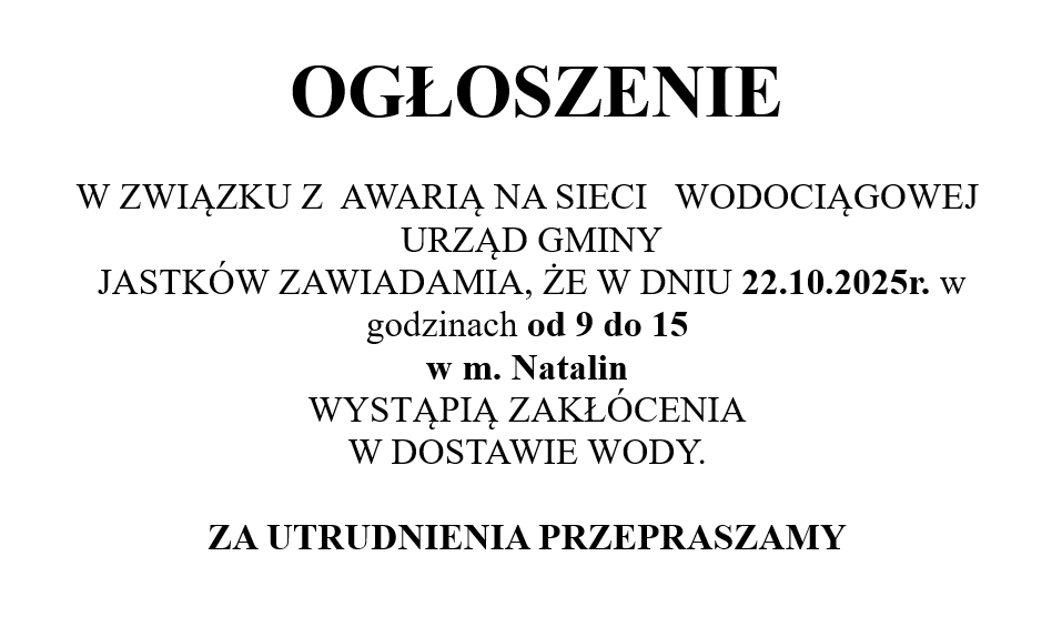 OGŁOSZENIE W ZWIĄZKU Z AWARIĄ NA SIECI WODOCIĄGOWEJ URZĄD GMINY JASTKÓW ZAWIADAMIA, ŻE W DNIU 22.10.2025R. W GODZINACH OD 9 DO 15 W M. NATALIN WYSTĄPIĄ ZAKŁÓCENIA W DOSTAWIE WODY.