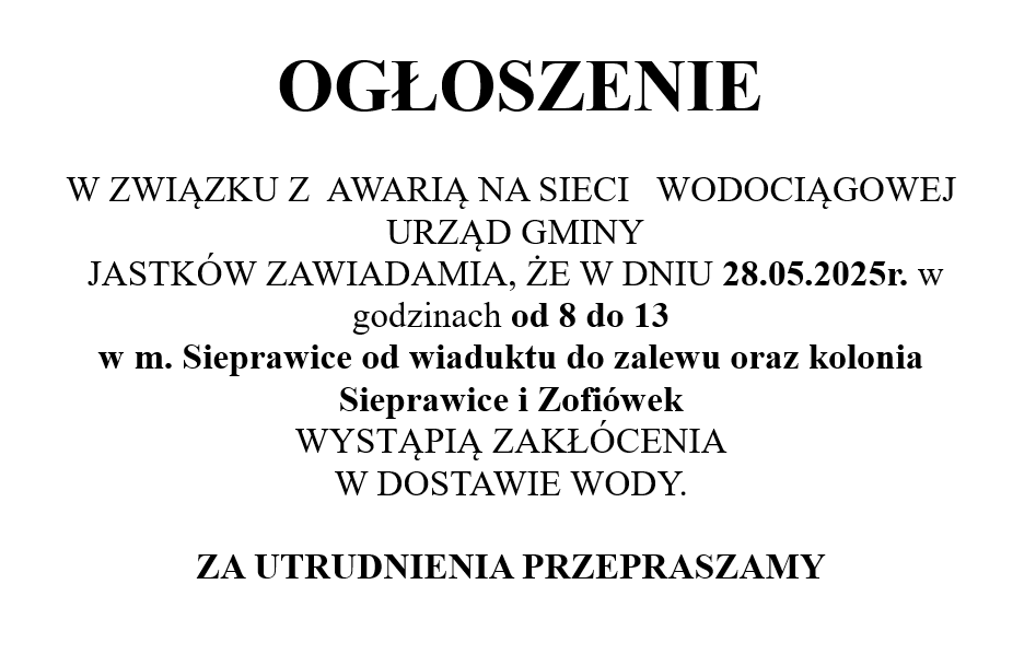 OGŁOSZENIE W ZWIĄZKU Z AWARIĄ NA SIECI WODOCIĄGOWEJ URZĄD GMINY JASTKÓW ZAWIADAMIA, ŻE W DNIU 28.05.2025R. W GODZINACH OD 8 DO 13 W M. SIEPRAWICE OD WIADUKTU DO ZALEWU ORAZ KOLONIA SIEPRAWICE I ZOFIÓWEK WYSTĄPIĄ ZAKŁÓCENIA W DOSTAWIE WODY.