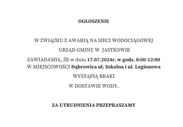 OGŁOSZENIE W ZWIĄZKU Z AWARIĄ NA SIECI WODOCIĄGOWEJ URZĄD GMINY W JASTKOWIE
