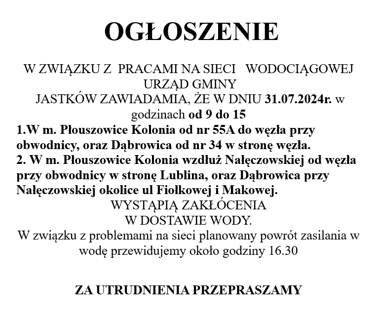 OGŁOSZENIE W ZWIĄZKU Z PRACAMI NA SIECI WODOCIĄGOWEJ URZĄD GMINY JASTKÓW ZAWIADAMIA