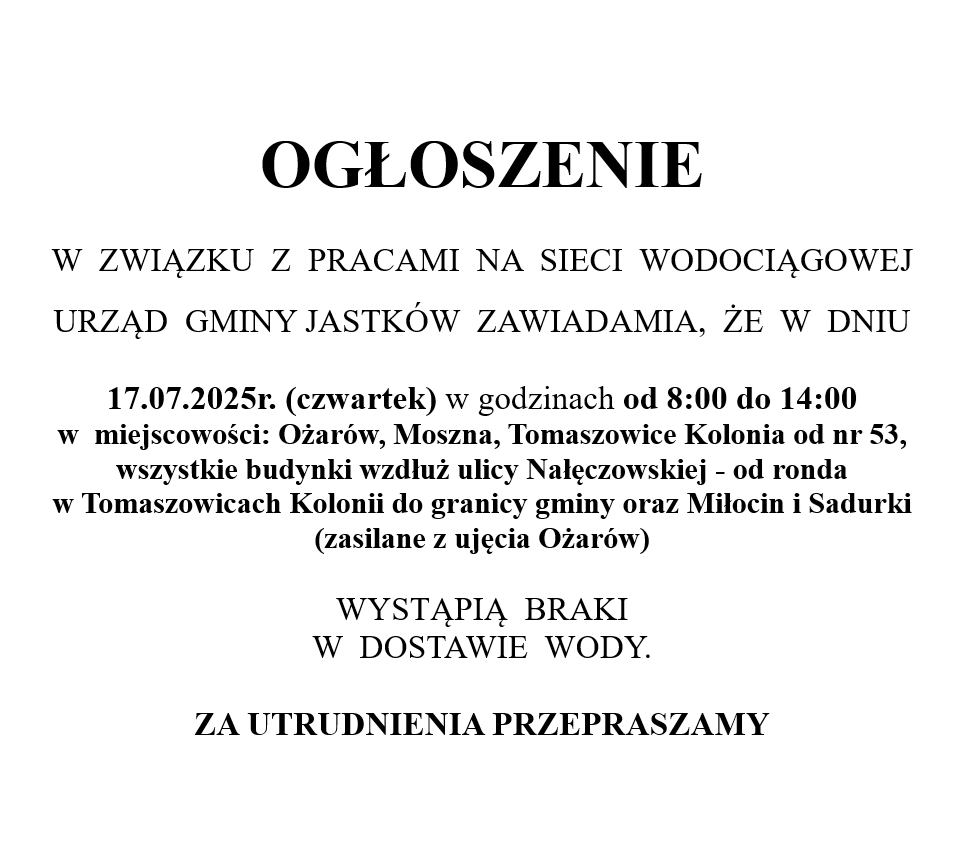 OGŁOSZENIE W ZWIĄZKU Z PRACAMI NA SIECI WODOCIĄGOWEJ URZĄD GMINY W JASTKOWIE