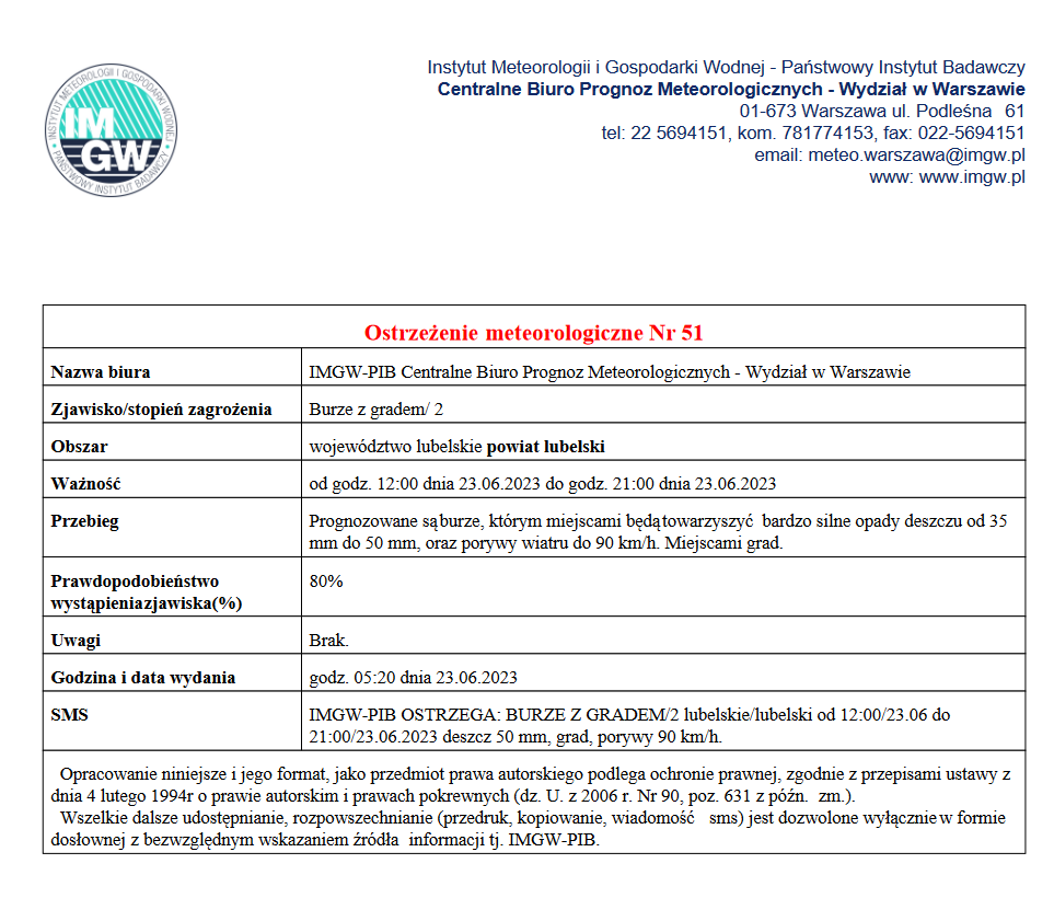 OSTRZEŻENIE METEOROLOGICZNE - 23 CZERWCA 2023
