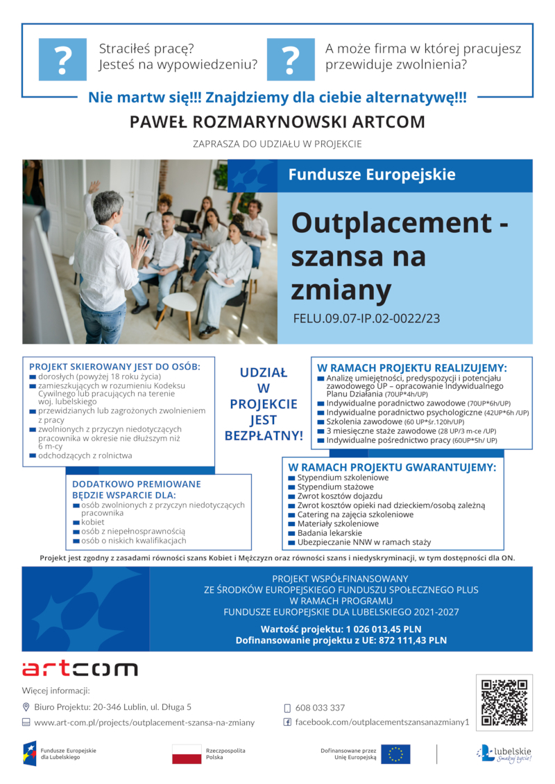https://www.art-com.pl/projects/outplacement-szansa-na-zmiany/, a także w Biurze Projektów pod numerem tel. 608 033 337.