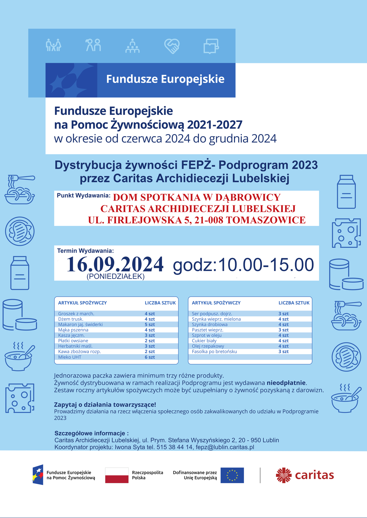 Gminny Ośrodek Pomocy Społecznej w Jastkowie informuje, że w dniu 16 września 2024 roku (poniedziałek) w godz. od 10.00 do 15.00 w Domu Spotkania Caritas w Dąbrowicy przy ul. Firlejowska 5 będą wydawane paczki żywnościowe dla osób, które zostały zakwalifikowane do otrzymania pomocy żywnościowej w ramach Programu Fundusze Europejskie na Pomoc Żywnościową 2021-2027 - Podprogram 2023 współfinansowanego z Europejskiego Funduszu Społecznego Plus.