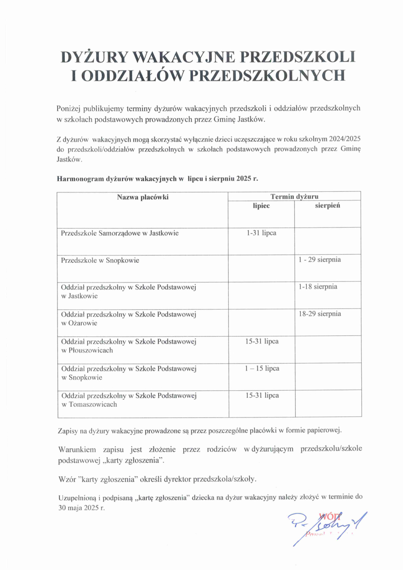 PLAN DYŻURÓW PLACÓWEK OŚWIATOWYCH NA WAKACJE