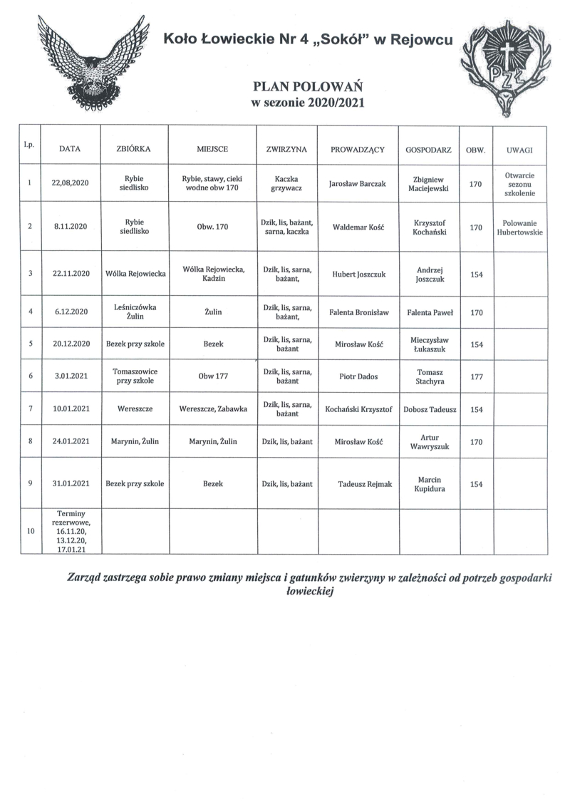 PLAN POLOWAŃ W SEZONIE 2020/2021 KOŁA ŁOWIECKIEGO NR 4 „SOKÓŁ” W REJOWCU