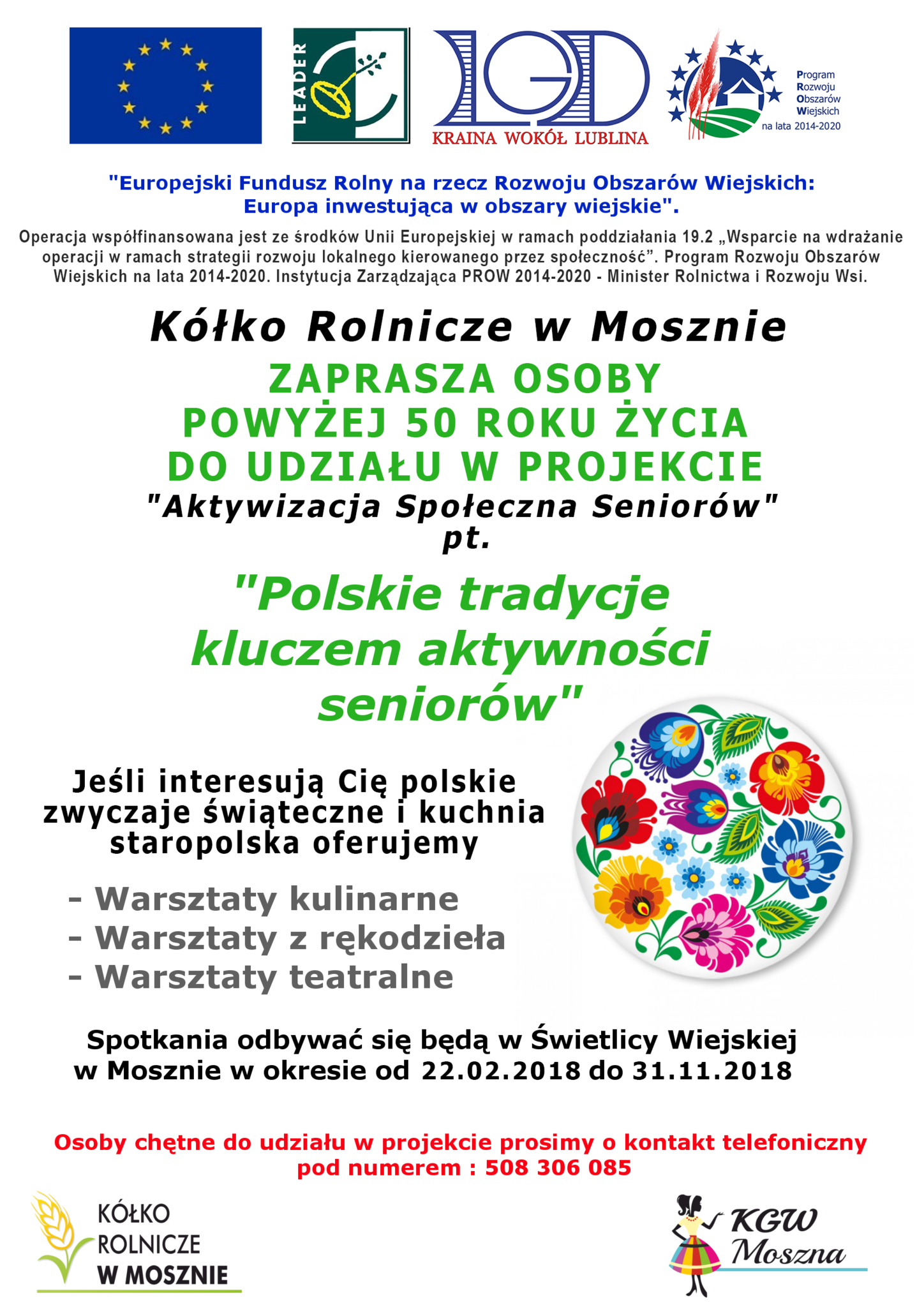 Kółko Rolnicze w Mosznie zaprasza osoby powyżej 50 roku życia do udziału w projekcie "Aktywizacja Społeczna Seniorów" pt. "Polskie tradycje kluczem aktywności seniorów"