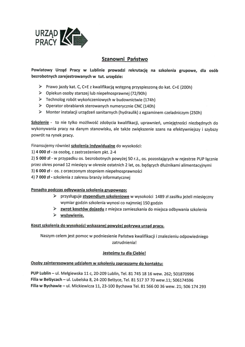POWIATOWY URZĄD PRACY W LUBLINIE PROWADZI REKRUTACJĘ NA SZKOLENIA GRUPOWE