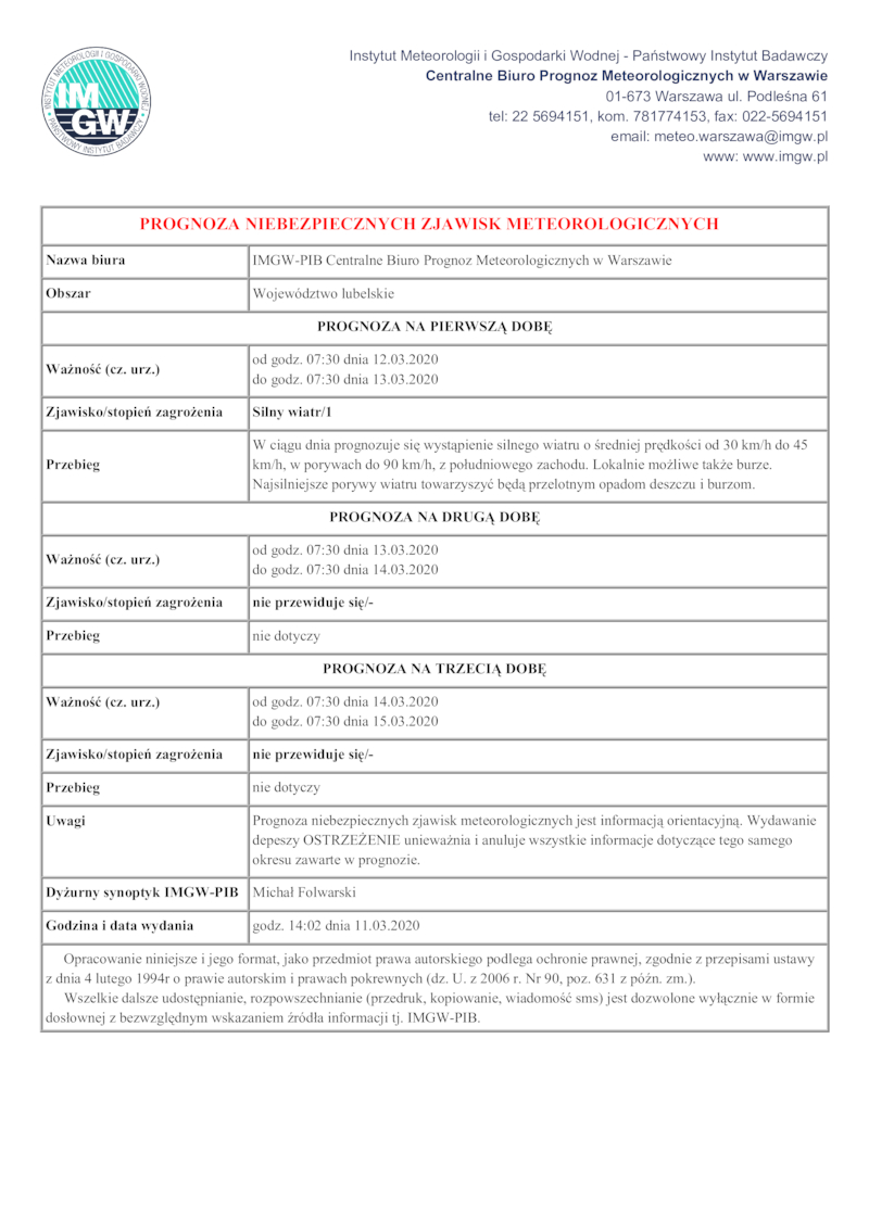 PROGNOZA NIEBEZPIECZNYCH ZJAWISK METEOROLOGICZNYCH