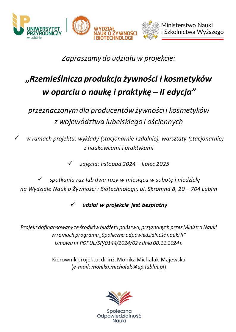 Zapraszamy do udziału w projekcie „Rzemieślnicza produkcja żywności i kosmetyków w oparciu o naukę i praktykę - II edycja" dofinansowanym jest przez Ministerstwo Nauki i Szkolnictwa Wyższego w ramach programu "Społeczna odpowiedzialność nauki II".