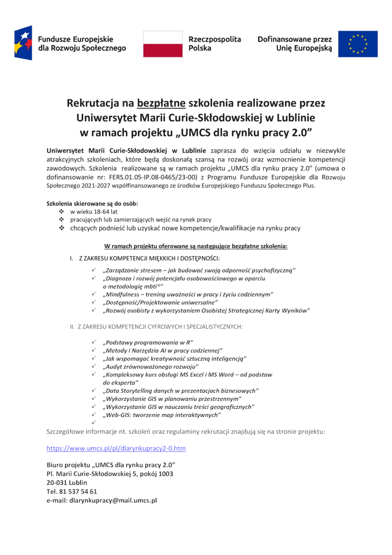 REKRUTACJA NA BEZPŁATNE SZKOLENIA REALIZOWANE PRZEZ UNIWERSYTET MARII CURIE- SKŁODOWSKIEJ W LUBLINIE W RAMACH PROJEKTU „UMCS DLA RYNKU PRACY 2.0”