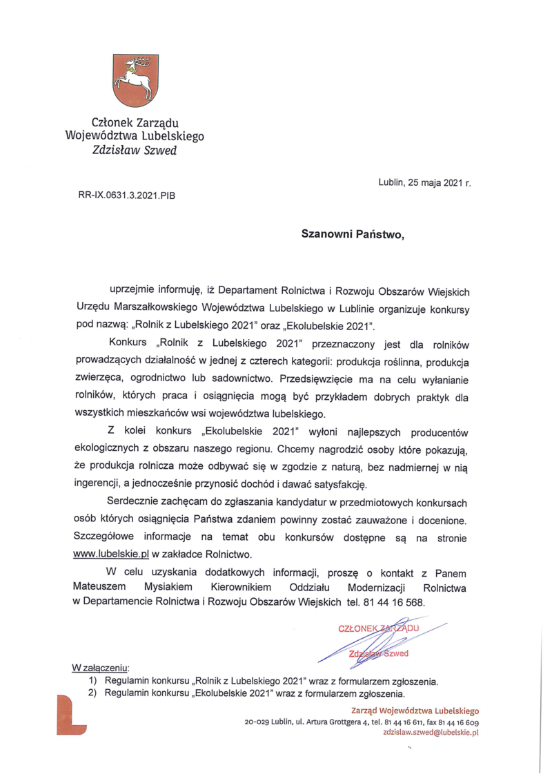 ROZPOCZĄŁ SIĘ NABÓR APLIKACJI KONKURSOWYCH DO KONKURSÓW PN. „ROLNIK Z LUBELSKIEGO 2021” I „EKOLUBELSKIE 2021”.