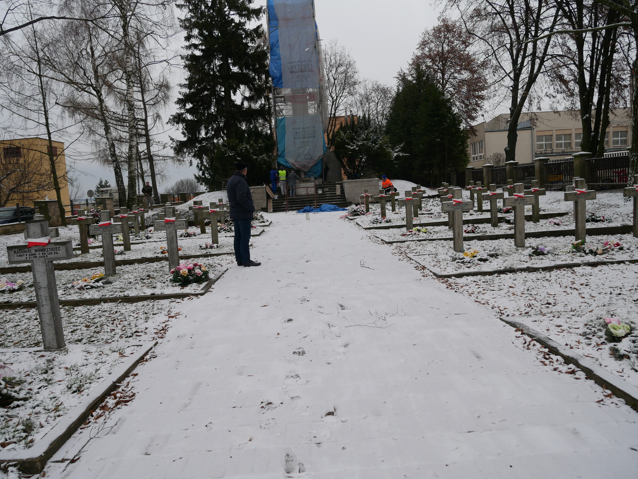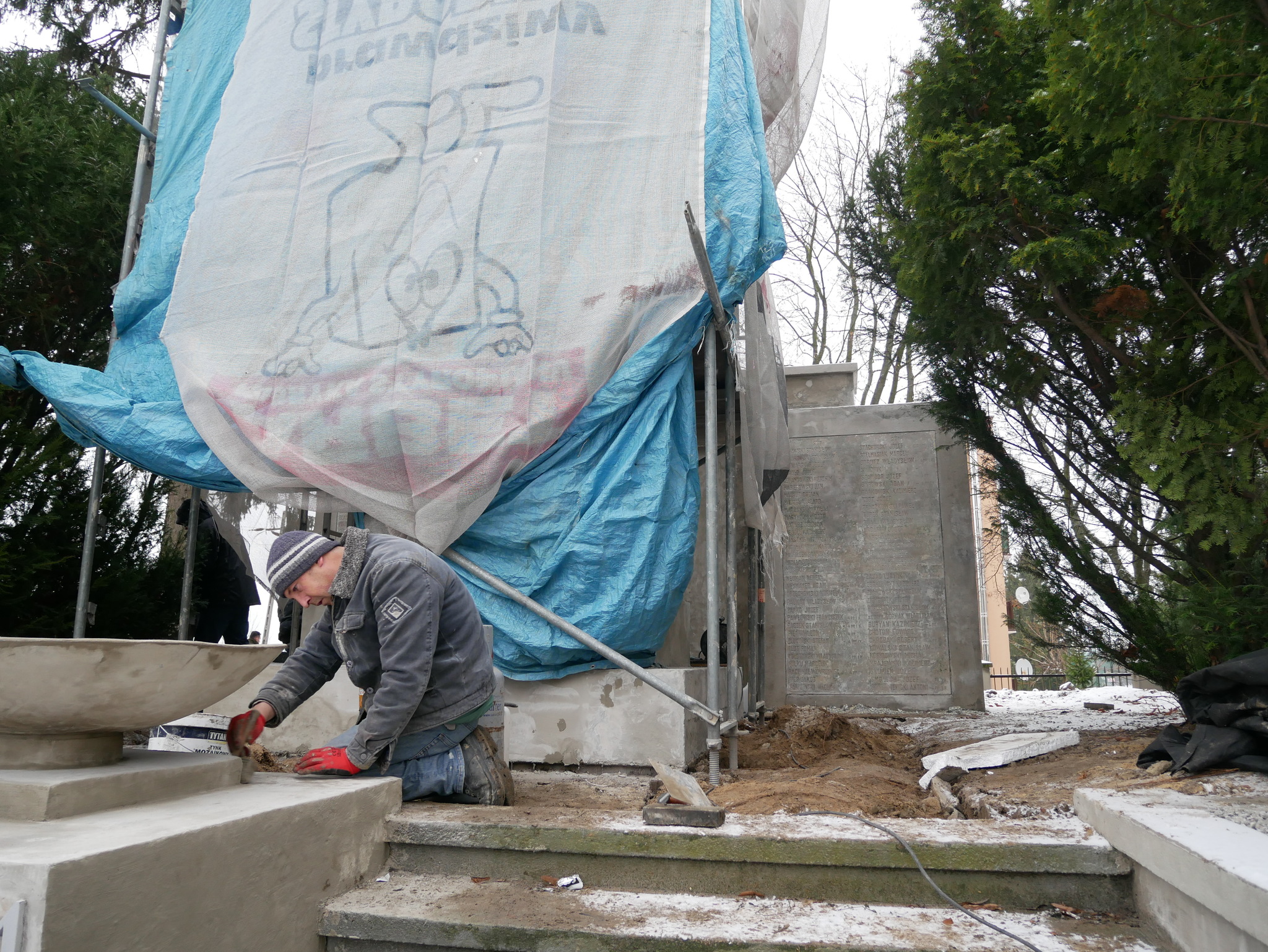 Zawarcie umowy z Ministrem KiDN pozwoliło na uruchomienie procedur i rozpoczęcie robót. Zakres robót budowlano-renowacyjnych obejmuje odnowienie pomnika wraz z jego otoczeniem a co najważniejsze przywrócenie czytelności tablicom pamiątkowym. Wyłoniona w postępowaniu firma budowlana rozpoczęła pracę w dniu 5. 11. 2018 r. a ich zakończenie przewidziano na 20. 12. 2018 r. – wartość robót – 141,4 tys. zł brutto. Równolegle rozpoczęto prace z zakresu utrzymania zieleni na cmentarzu polegające na wycince niektórych drzew, wykonaniu cięć pielęgnacyjnych na pozostałych, oraz posadzeniu nowych drzew, krzewinek i róż. Prace te mają na celu odsłonięcie pomnika i cmentarza oraz urządzenie kompozycji roślinnej dopełniającej wizerunek miejsca pamięci. Na dzień 18. 12. 2018 r. prace te zostały wykonane i odebrane a ich wartość wyniosła 17,5 tys. zł brutto.