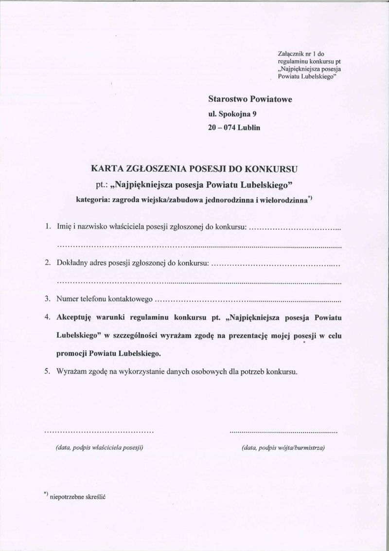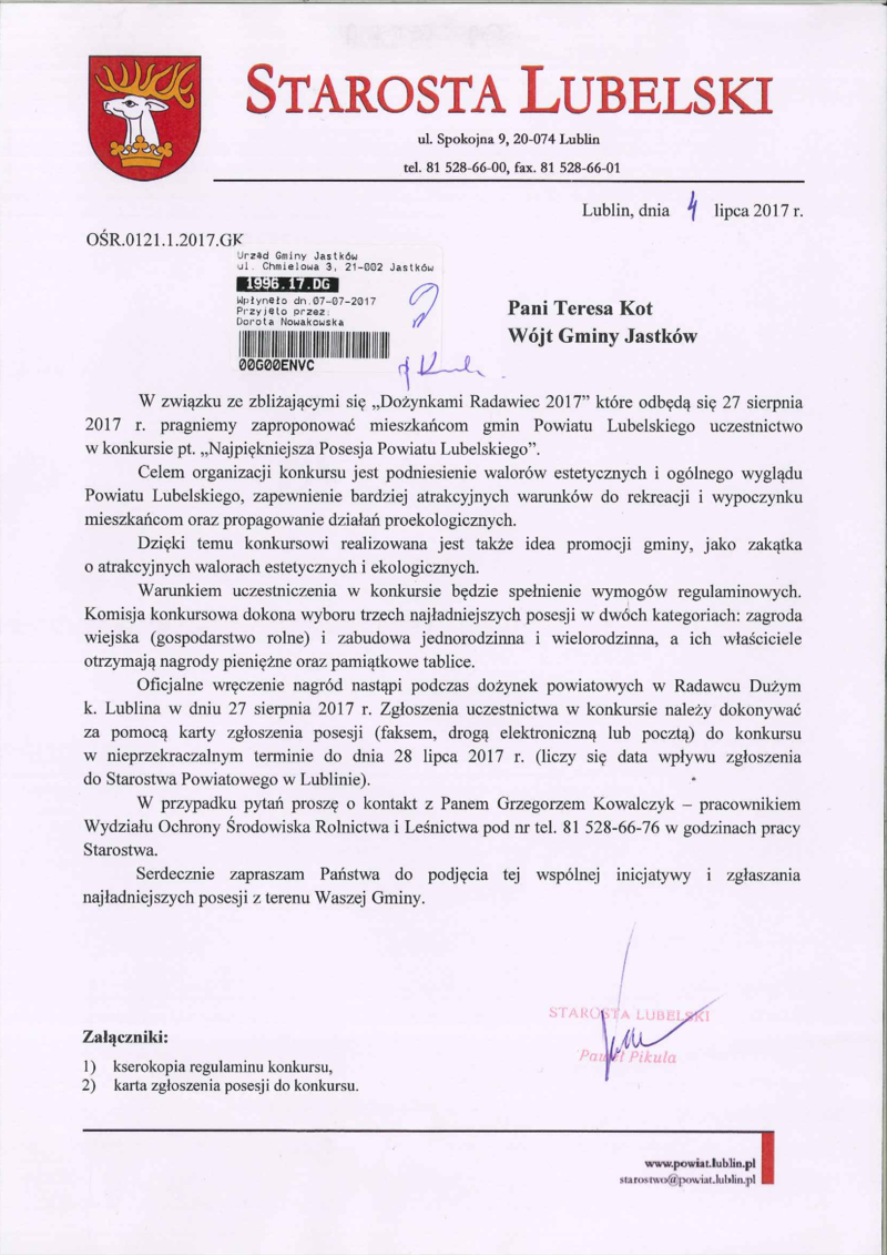 Oficjalne wręcznie nagród nastapi podczas dożynek powiatowych w Radawcu w dniu 27 sierpnia 2017r. Kartę zgłoszeniową należy przesłąć do Starostwa Powiatowego w Lublinie w nieprzekraczalnym terminie do dnia 28 lipca 2017 r.