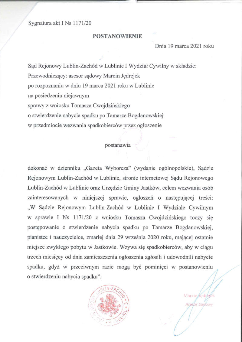 SĄD REJONOWY LUBLIN-ZACHÓD W LUBLINIE I WYDZIAŁ CYWILNY W SPRAWIE Z UDZIAŁEM GMINY JASTKÓW