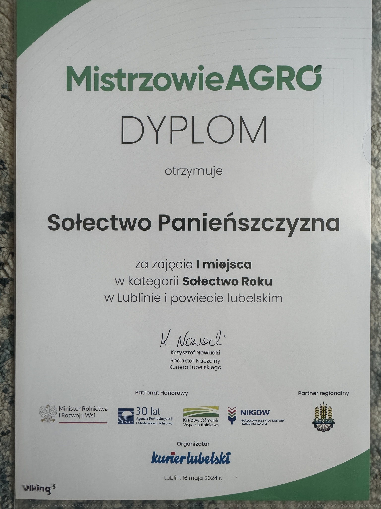 SOŁECTWO PANIEŃSZCZYZNA ZAJĘŁO I MIEJSCE W LUBLINIE I POWIECIE LUBELSKIM W KATEGORII SOŁECTWO ROKU W PLEBISCYCIE MISTRZOWIE AGRO!