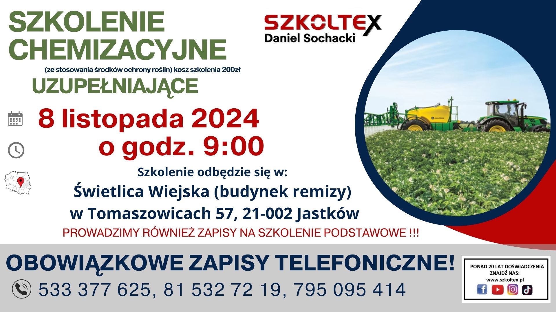 SZKOLENIE W ZAKRESIE STOSOWANIA ŚRODKÓW OCHRONY ROŚLIN (SZKOLENIE CHEMIZACYJNE UZUPEŁNIAJACE) które odbędzie się: