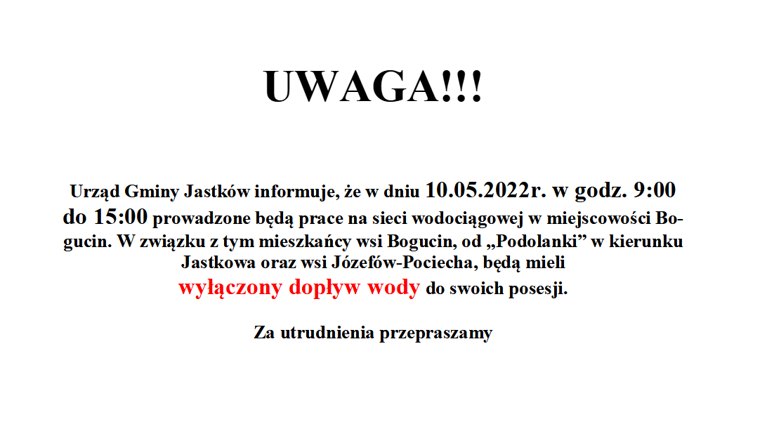 Urząd Gminy Jastków informuje, że w dniu 10.05.2022r. w godz. 9:00 do 15:00 prowadzone będą prace na sieci wodociągowej w miejscowości Bogucin. W związku z tym mieszkańcy wsi Bogucin, od „Podolanki” w kierunku Jastkowa oraz wsi Józefów-Pociecha, będą mieli