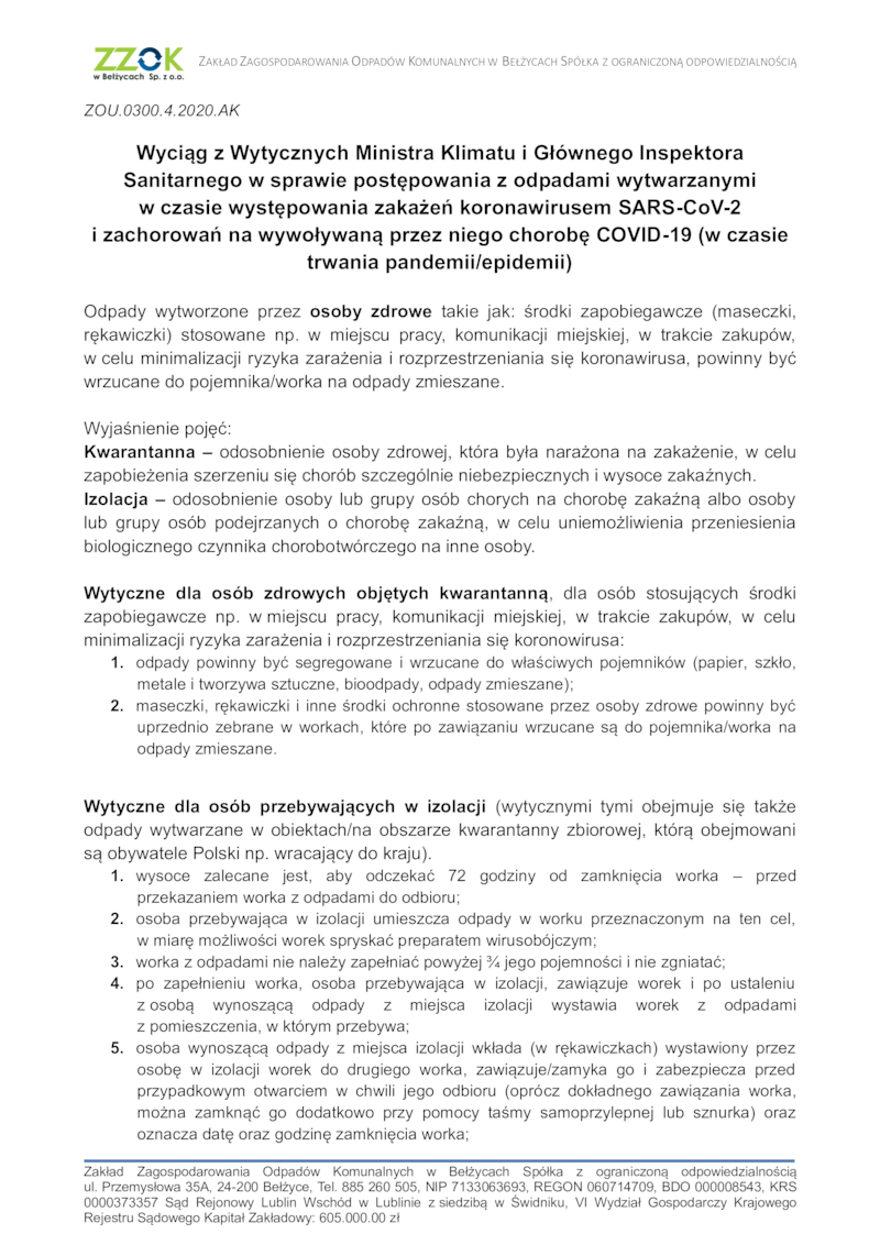 Sanitarnego w sprawie postępowania z odpadami wytwarzanymi w czasie występowania zakażeń koronawirusem SARS-CoV-2 i zachorowań na wywoływaną przez niego chorobę COVID-19 (w czasie trwania pandemii/epidemii)