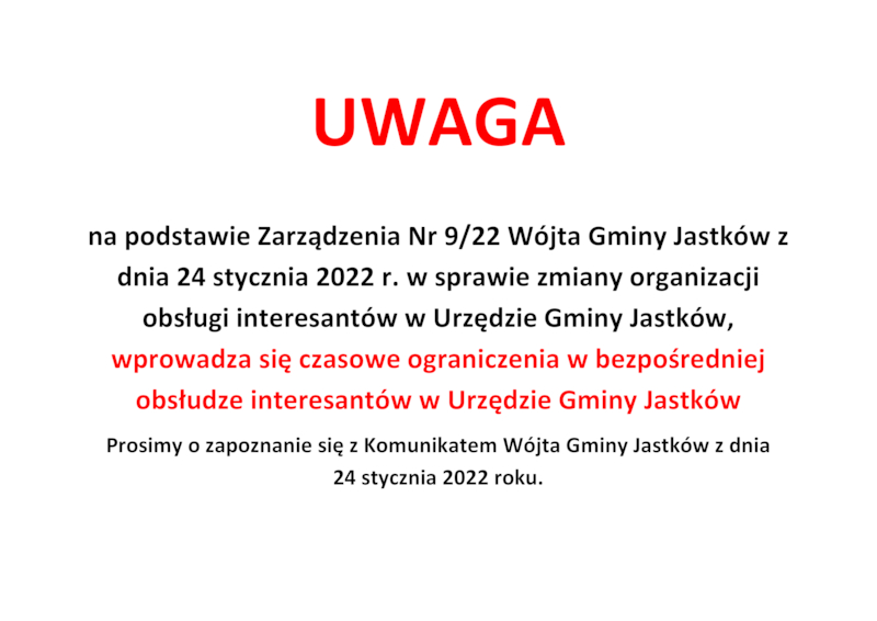 Szanowni Państwo, z uwagi na trudną sytuację związaną z utrzymującym się na terytorium Rzeczpospolitej Polskiej stanem epidemii informuję, że od 24 stycznia br. do odwołania - Urząd Gminy Jastków ogranicza bezpośrednią obsługę interesantów. Powyższe działania mają charakter prewencyjny.