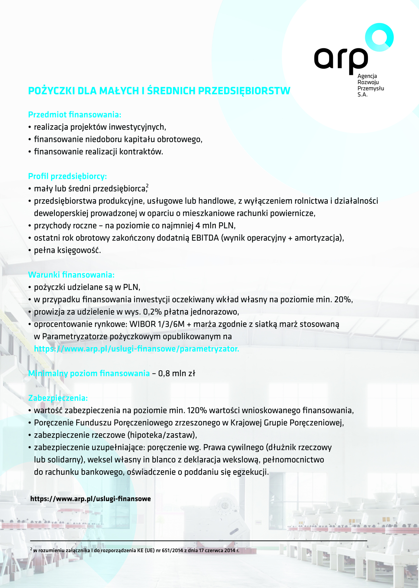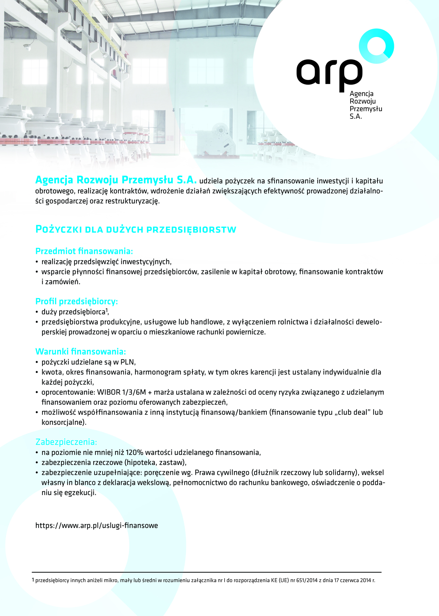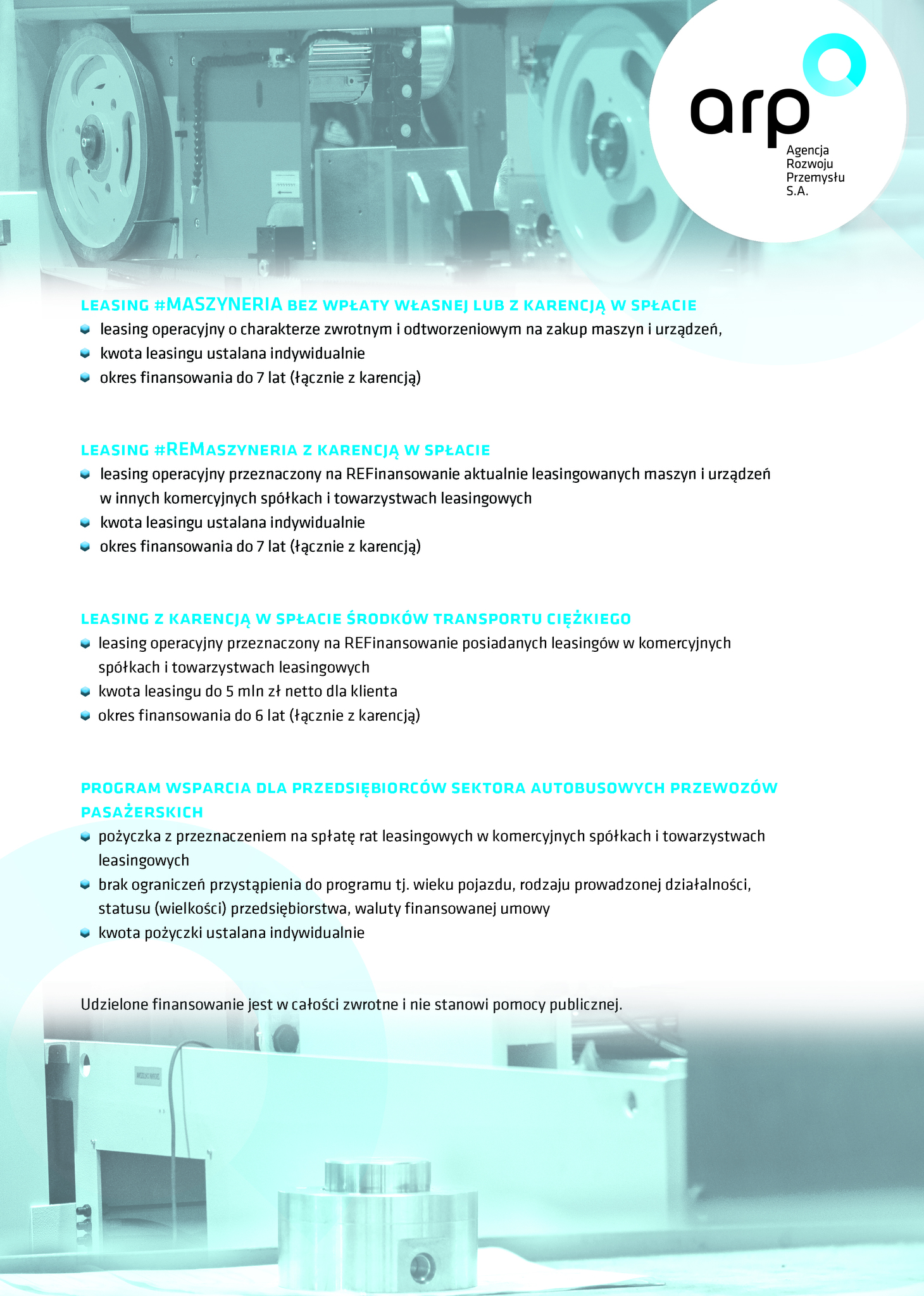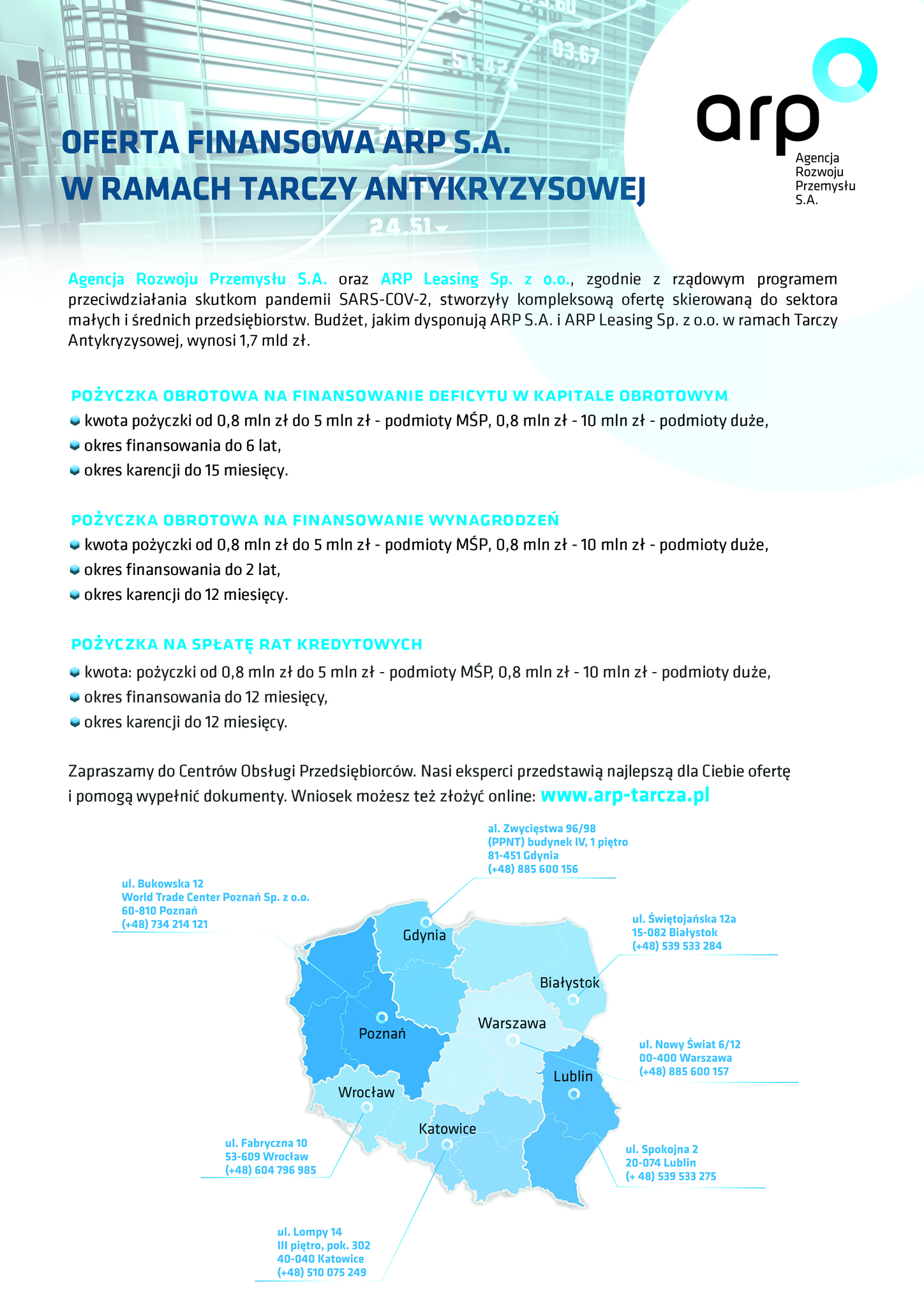 Informujemy, że otwarte na początku marca 2020 roku Centrum Obsługi Przedsiębiorców Agencji Rozwoju Przemysłu S.A. w Lublinie kieruje swoją ofertę instrumentów finansowych do firm z sektora Małych i Średnich oraz Dużych Przedsiębiorstw. Do dyspozycji przedsiębiorców pozostają pożyczki inwestycyjne, obrotowe, leasing, pomoc w działalności proeksportowej oraz produkty finansowe oferowane w ramach Tarczy Antykryzysowej, które stanowią pomoc dla firm w dobie pandemii koronawirusa lub będę pomocne podczas wychodzenia z pandemii. Agencja Rozwoju Przemysłu zapewnia również wsparcie merytoryczne dla przedsiębiorców w zakresie rozwoju.