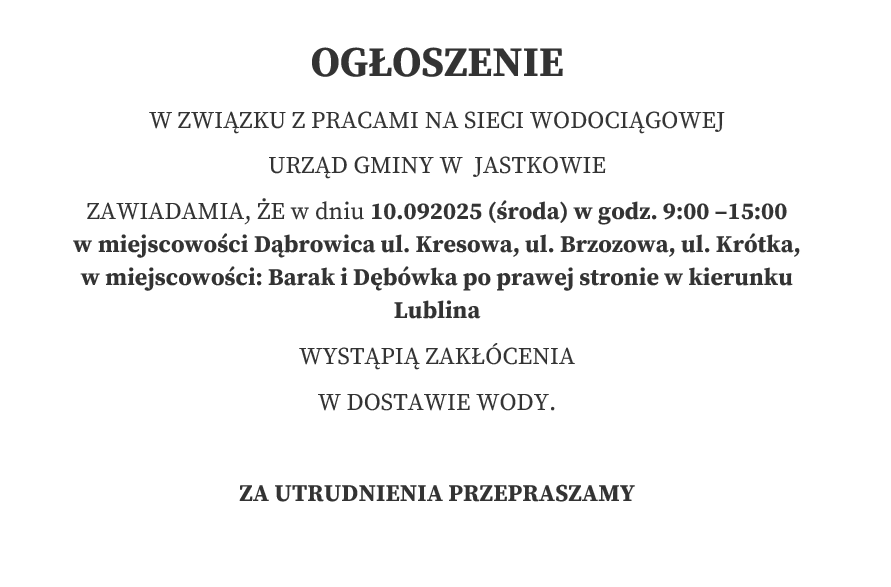 W DNIU 10.092025 (ŚRODA) W GODZ. 9:00 –15:00 W MIEJSCOWOŚCI DĄBROWICA UL. KRESOWA, UL. BRZOZOWA, UL. KRÓTKA, W MIEJSCOWOŚCI: BARAK I DĘBÓWKA PO PRAWEJ STRONIE W KIERUNKU LUBLINA WYSTĄPIĄ ZAKŁÓCENIA W DOSTAWIE WODY.
