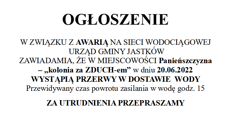 W ZWIĄZKU Z AWARIĄ NA SIECI WODOCIĄGOWEJ URZĄD GMINY JASTKÓW ZAWIADAMIA, ŻE W MIEJSCOWOŚCI PANIEŃSZCZYZNA – „KOLONIA ZA ZDUCH-EM” W DNIU 20.06.2022 WYSTĄPIĄ PRZERWY W DOSTAWIE WODY PRZEWIDYWANY CZAS POWROTU ZASILANIA W WODĘ GODZ. 15