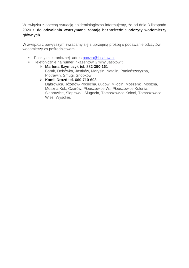 W ZWIĄZKU Z OBECNĄ SYTUACJĄ EPIDEMIOLOGICZNA INFORMUJEMY, ŻE OD DNIA 3 LISTOPADA 2020 R. DO ODWOŁANIA WSTRZYMANE ZOSTAJĄ BEZPOŚREDNIE ODCZYTY WODOMIERZY GŁÓWNYCH.