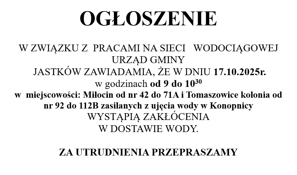 W ZWIĄZKU Z PRACAMI NA SIECI WODOCIĄGOWEJ URZĄD GMINY JASTKÓW ZAWIADAMIA, ŻE W DNIU 17.10.2025R. W GODZINACH OD 9 DO 1030 W MIEJSCOWOŚCI: MIŁOCIN OD NR 42 DO 71A I TOMASZOWICE KOLONIA OD NR 92 DO 112B ZASILANYCH Z UJĘCIA WODY W KONOPNICY WYSTĄPIĄ ZAKŁÓCENIA W DOSTAWIE WODY.