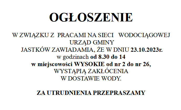 W ZWIĄZKU Z PRACAMI NA SIECI WODOCIĄGOWEJ URZĄD GMINY JASTKÓW ZAWIADAMIA, ŻE W DNIU 23.10.2023R. W GODZINACH OD 8.30 DO 14 W MIEJSCOWOŚCI WYSOKIE OD NR 2 DO NR 26, WYSTĄPIĄ ZAKŁÓCENIA W DOSTAWIE WODY.