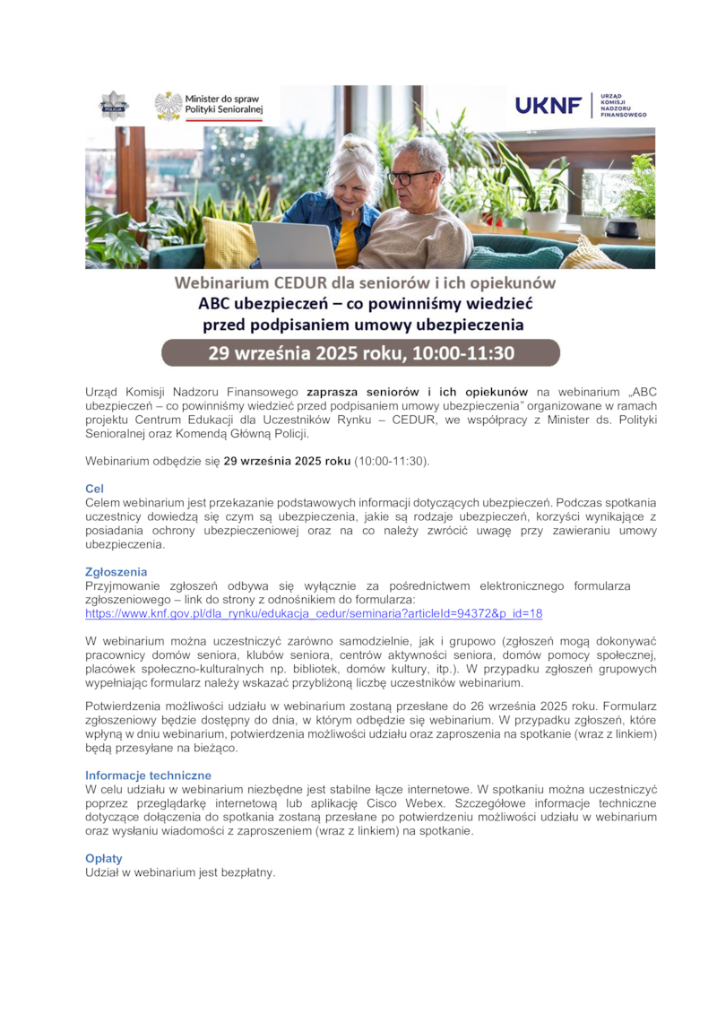Webinarium jest organizowane przez Urząd Komisji Nadzoru Finansowego w ramach projektu Centrum Edukacji dla Uczestników Rynku – CEDUR, we współpracy m.in. z Komendą Główną Policji.