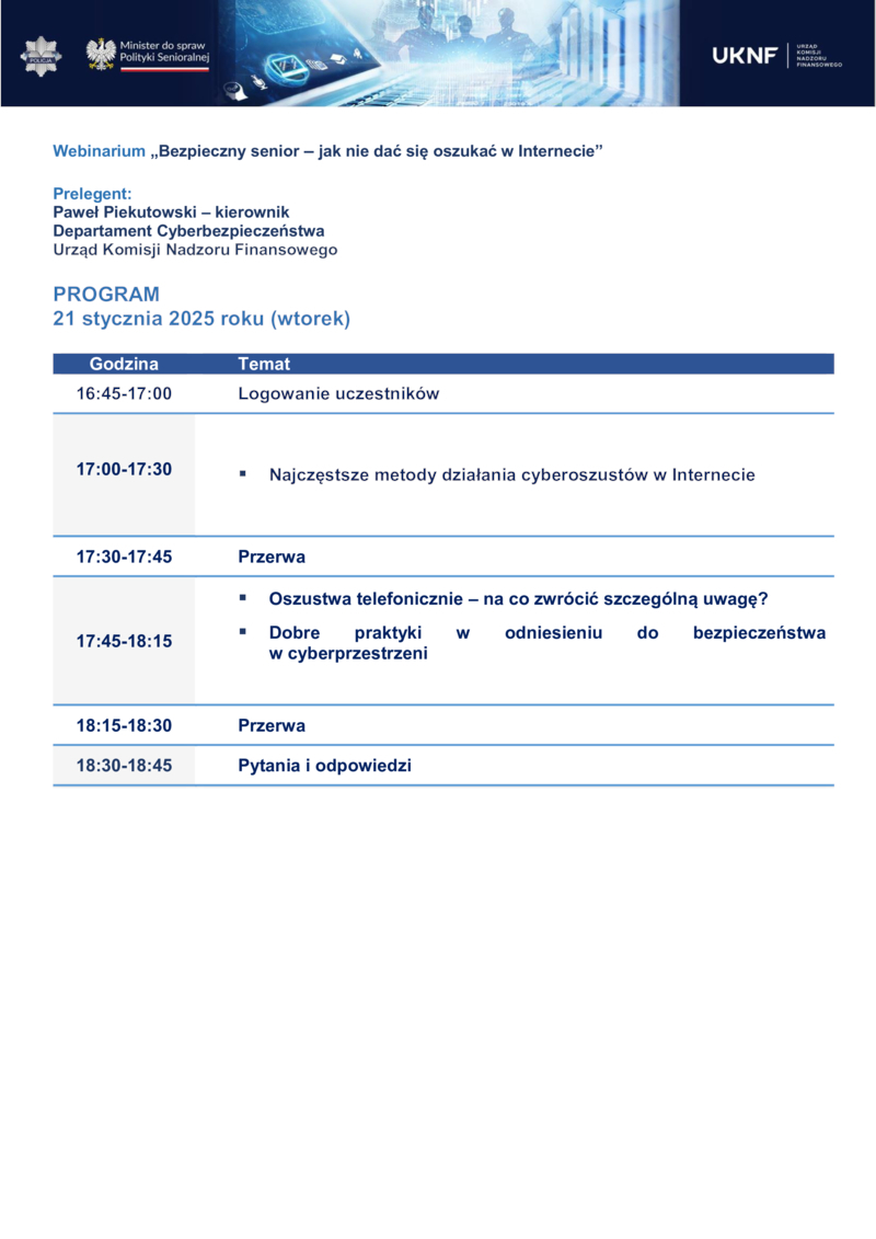 Urząd Komisji Nadzoru Finansowego zaprasza seniorów i ich opiekunów na webinarium (spotkanie online) „Bezpieczny senior – jak nie dać się oszukać w Internecie” organizowane