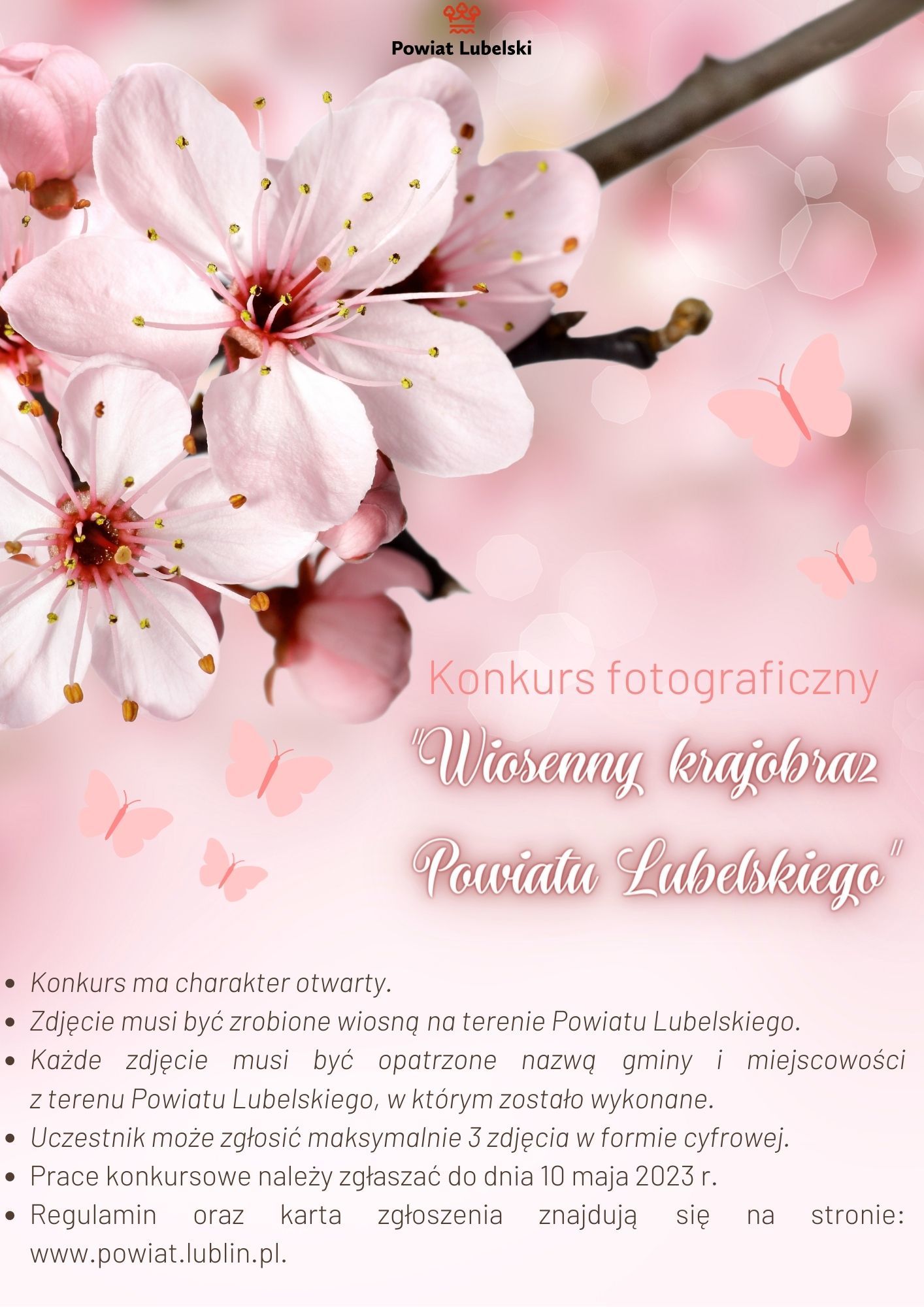 Konkursu fotograficzny "Wiosenny krajobraz Powiatu Lubelskiego". Konkurs skierowany jest do mieszkańców Powiatu, jak również osób odwiedzających go. Warunkiem wzięcia udziału jest zrobienie zdjęcia/zdjęć (max. 3 fotografie) na terenie Powiatu Lubelskiego. Konkurs jest okazją do zaprezentowania tematycznych fotografii szerokiej grupie odbiorców, jak również ma na celu pokazanie walorów krajobrazu Powiatu Lubelskiego.