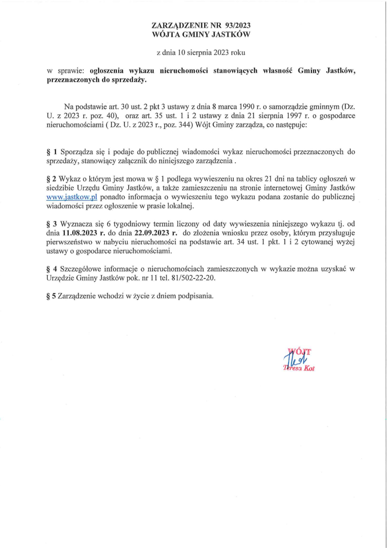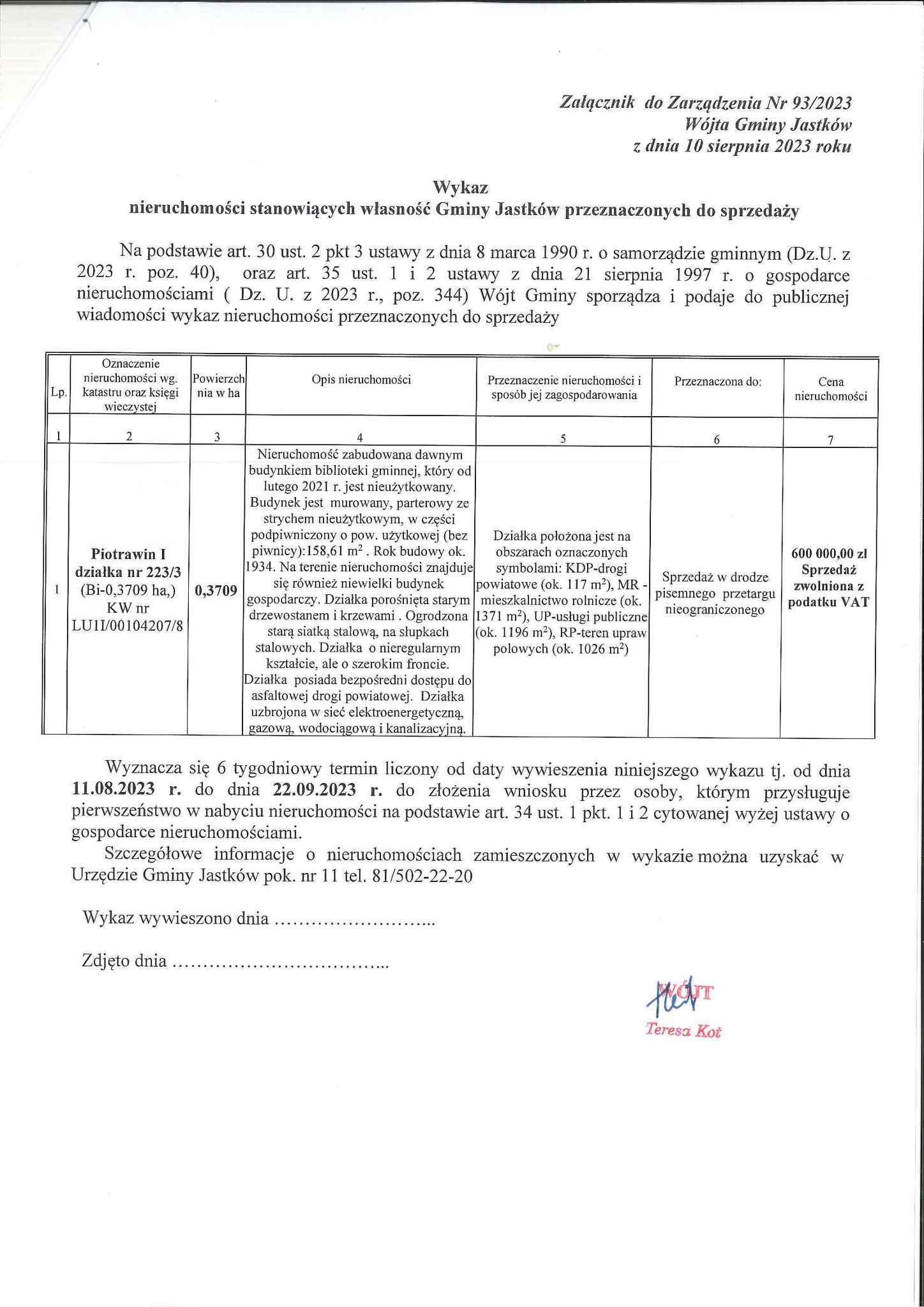 WYKAZ NIERUCHOMOŚCI STANOWIĄCYCH WŁASNOŚĆ GMINY JASTKÓW, PRZEZNACZONYCH DO SPRZEDAŻY.
