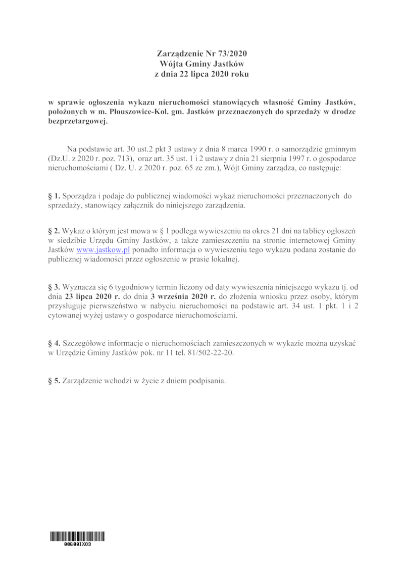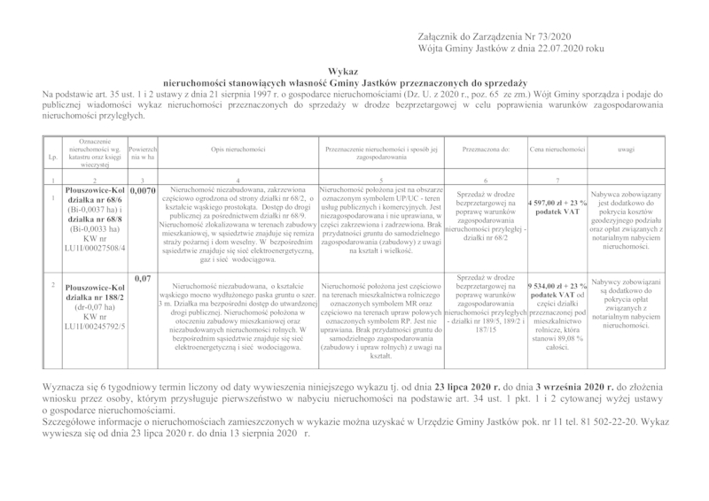 WYKAZ NIERUCHOMOŚCI STANOWIĄCYCH WŁASNOŚĆ GMINY JASTKÓW PRZEZNACZONYCH DO SPRZEDAŻY