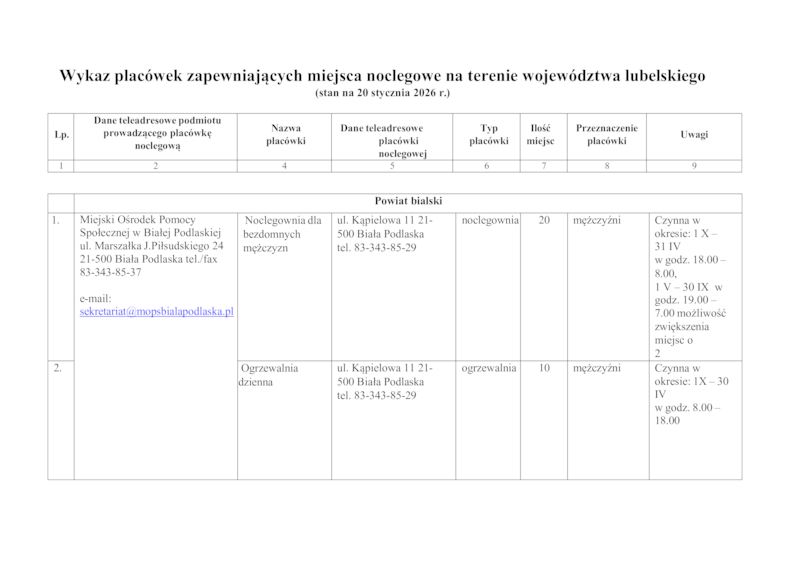 WYKAZ OBIEKTÓW ZNAJDUJĄCYCH SIĘ NA TERENIE WOJEWÓDZTWA LUBELSKIEGO PRZEZNACZONYCH DO UDZIELANIA IM SCHRONIENIA ORAZ WSPARCIA